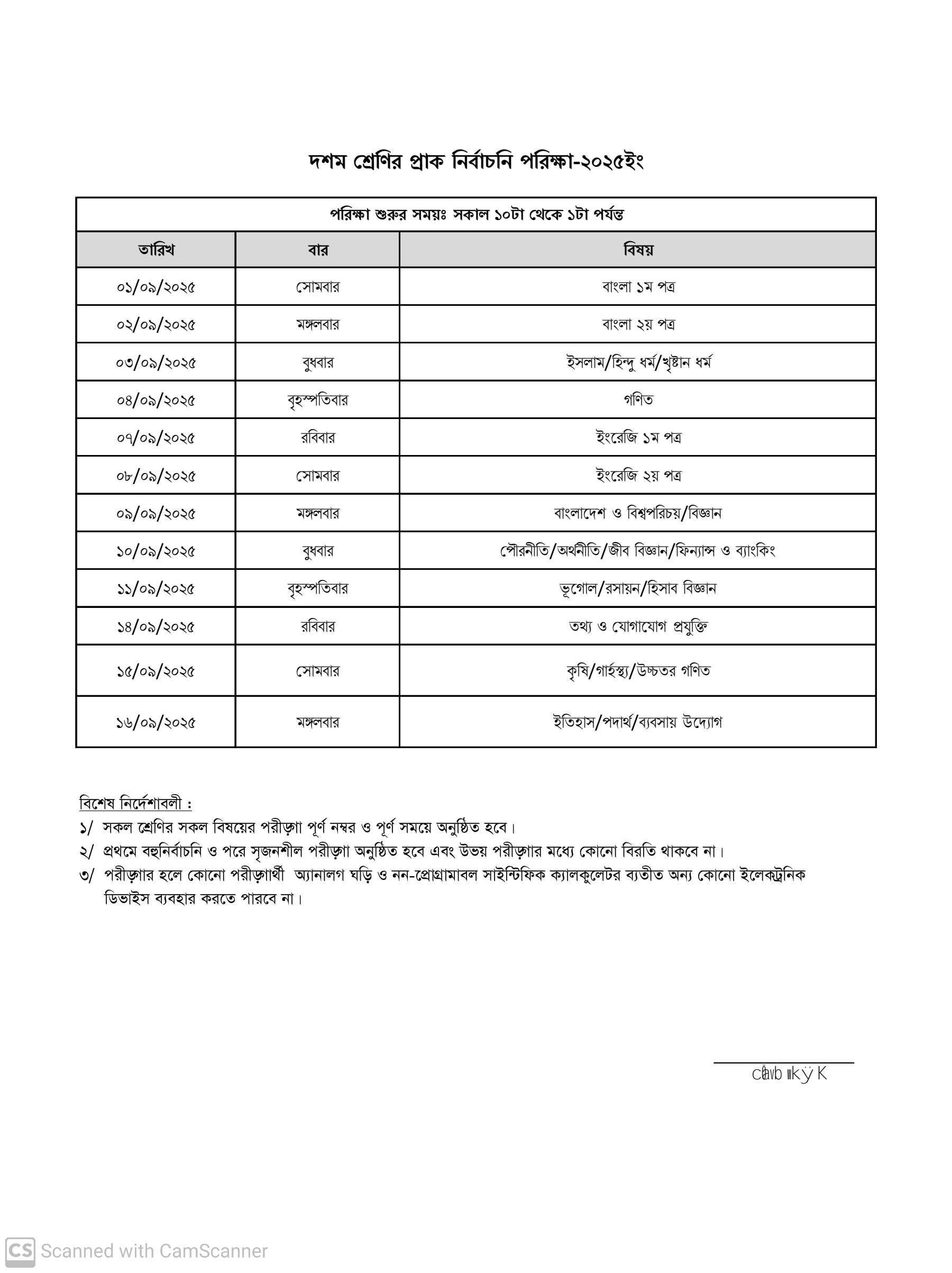 দশম শ্রেণির প্রাক নির্বাচনী পরীক্ষার রুটিন