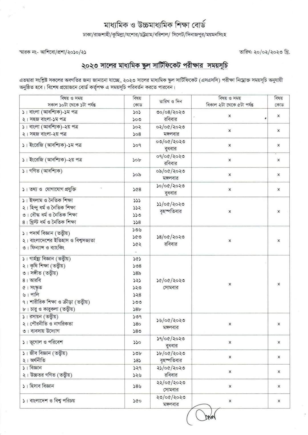 ২০২৩ সালের এসএসসি পরীক্ষার সময়সূচিDate : 02-Oct-2022